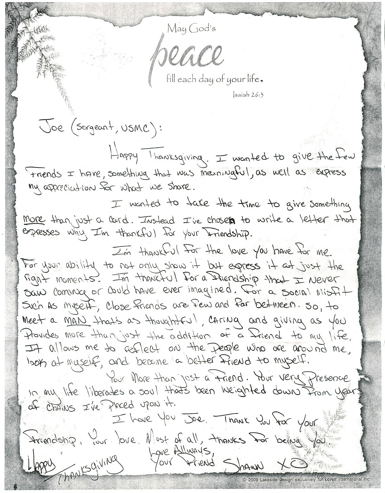 Shawn is a young inmate that Joe has befriended. Their connection has been particularly valuable and a great comfort to Shawn, as Shawn's Thanksgiving letter makes clear.
